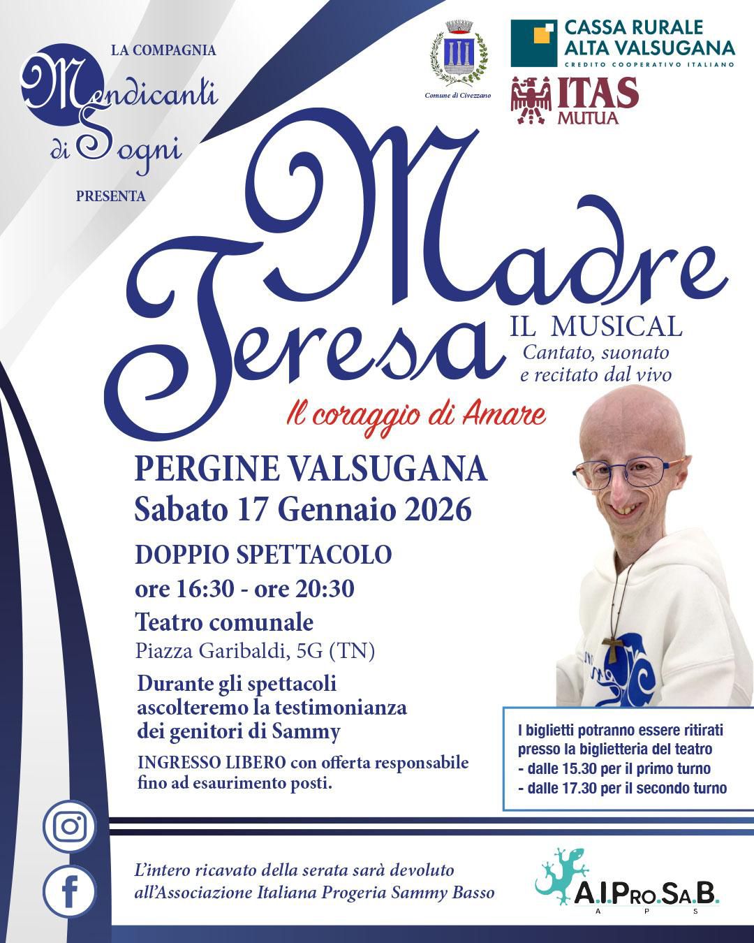 Domani al Teatro Comunale di Pergine Valsugana alle 16.30 e alle 20.30 va in sena “Madre Teresa, il coraggio di amare”, uno spettacolo teatrale benefico. In scena la compagnia Mendicanti di Sogni, per una serata dedicata a Sammy Basso. L’iniziativa, con ingresso gratuito con offerta libera, è organizzata da un gruppo di volontari delle Parrocchie di Civezzano, Seregnano e Fornace insieme a diverse associazioni del territorio. Il ricavato delle offerte sarà devoluto all’Associazione Italiana Progeria Sammy Basso per sostenere la ricerca. Presenti anche i genitori di Sammy, per una testimonianza di memoria, impegno e speranza.