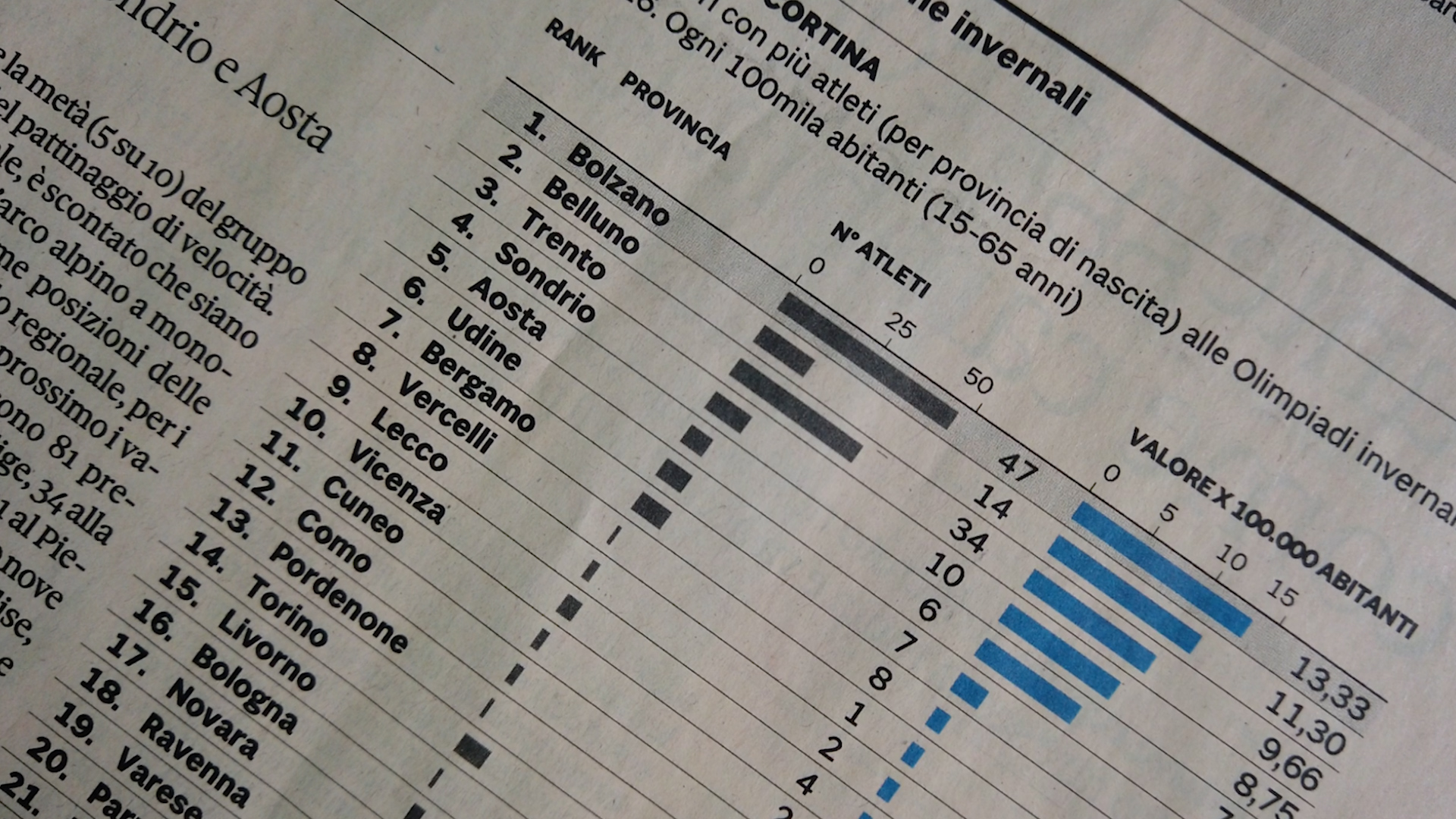 Bolzano, Belluno e Trento culle degli atleti che parteciperanno a Milano Cortina 2026. Mancano 4 giorni e il quotidiano economico “Il sole 24 ore” propone un’indagine di PTS Sport. Viene analizzato l’apporto che le Province italiane danno al contingente azzurro. La Provincia di Bolzano vince nettamente la classifica, sia per quello che riguarda le competizioni che stanno per partire, sia se si guarda la serie storica dal 2002 al 2022. 47 gli altoatesini al via a Milano Cortina, ben 34 per la pattuglia trentina. Si attesta al 10 per cento il valore del territorio trentino con più atleti che gareggeranno a Milano Cortina ogni 100mila abitanti. Scorrendo i dati salta agli occhi, per esempio, che la Provincia di Trento fornirà esattamente la metà del gruppo azzurro del pattinaggio velocità. Guardando i dati storici dal 2002 al 2022 sulle partecipazioni di campioni trentini ai giochi invernali, Trento ne ha forniti ben 86, Bolzano 247.